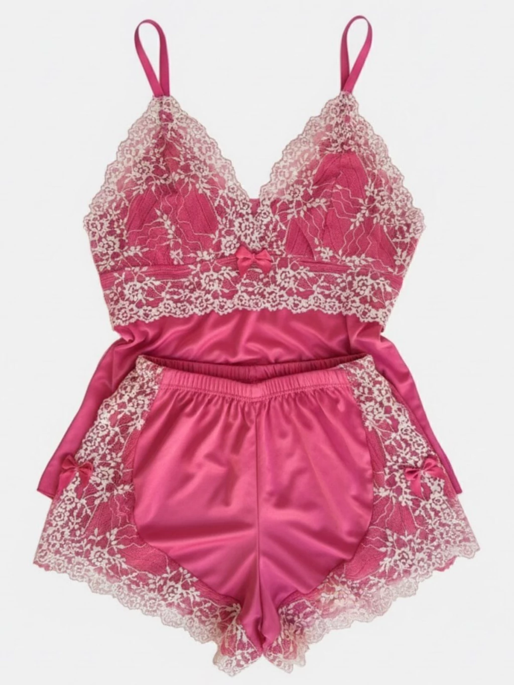Confeccionado em ligalight leve e macio, semelhante ao algodão, garante caimento impecável e toque suave. A camiseta sem bojo possui forro costurado à renda no busto e nas costas, além de alças em elástico regulável. O short é um charme à parte, com laterais em renda, abertura discreta unida por laço em cetim e cintura em elástico confortável.
