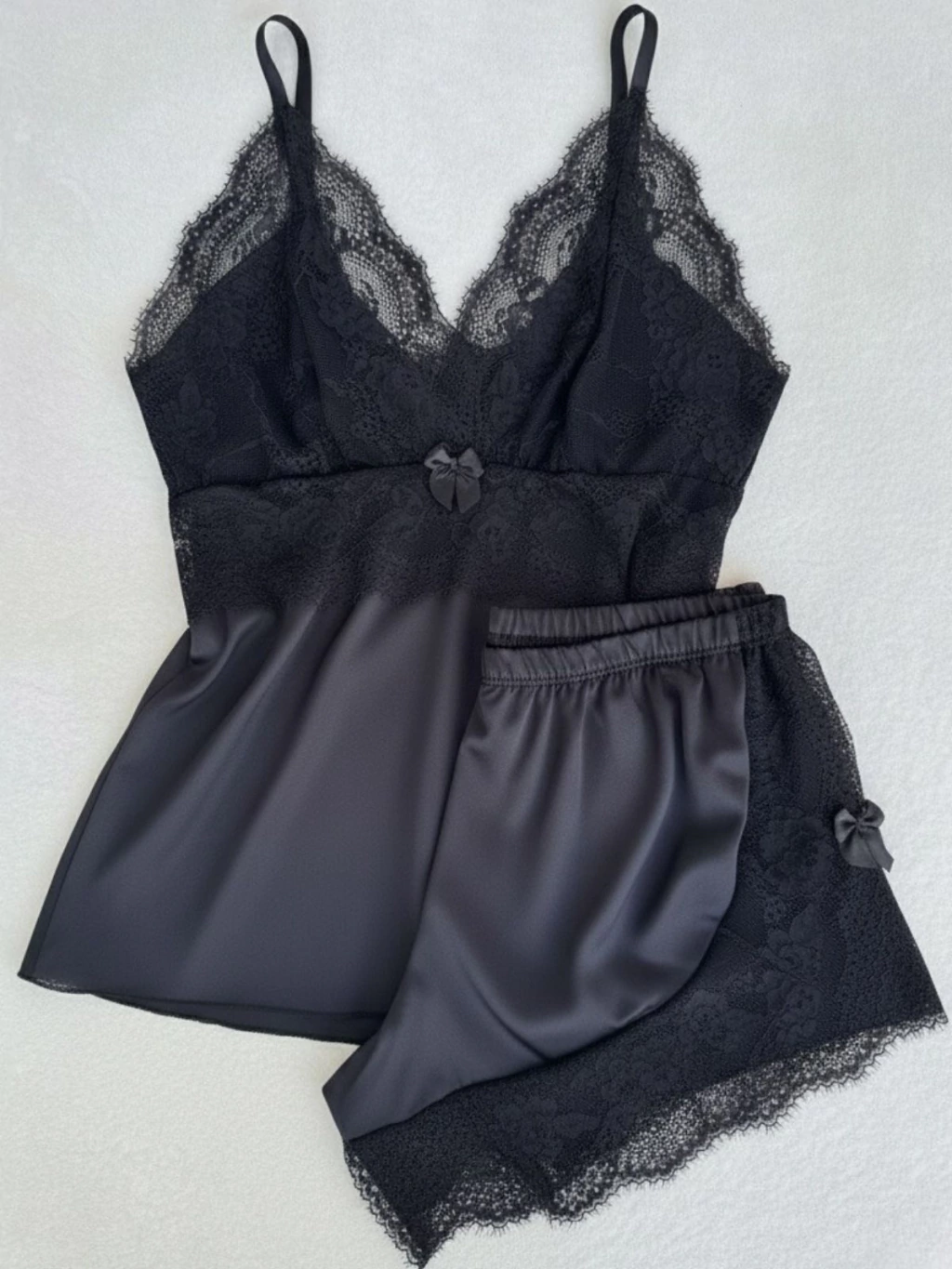 O short tem laterais em renda com abertura discreta unida por laço em cetim e cintura em elástico confortável, garantindo caimento perfeito com um toque sensual.