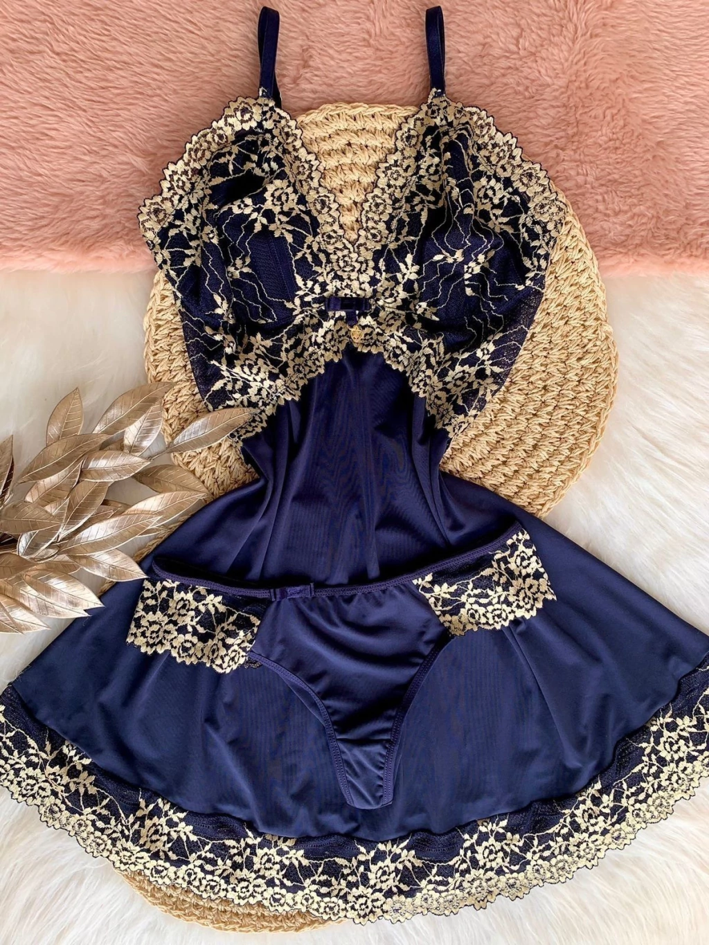 • Acabamentos: Alças reguláveis na camisola; renda aplicada no busto, costas e barra da camisola e na calcinha