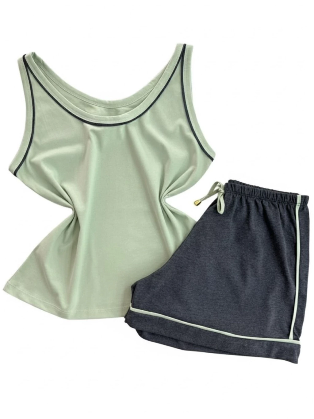 A regata possui acabamento em viés contrastante, criando um visual moderno e delicado. O short com elástico na cintura oferece ajuste perfeito ao corpo, enquanto o amarril em algodão com ponteiras metálicas adiciona um toque sofisticado ao conjunto.