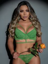 Renda nas duas peças, trazendo delicadeza e sofisticação.
